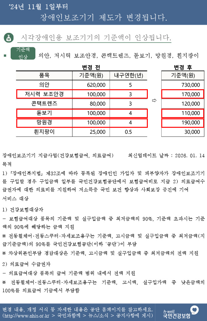 2024.11.1.부터 장애인보조기기 제도가 아래와 같이 변경되오니 참고하시기 바랍니다. (변경사항)의안, 저시력 보조안경, 돋보기, 콘택트렌즈, 망원경, 흰지팡이 품목의 기준액이 인상됩니다.